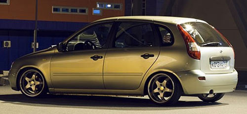 Еще один пример не слишком удачного тюнинга Lada Kalina 2. Изысканная выразительность плавных обводов золотистого тона становится тяжеловесной над избыточно деликатными колесиками. И если передняя пара «кряхтит, но держит», задние колеса того и гляди подломятся.